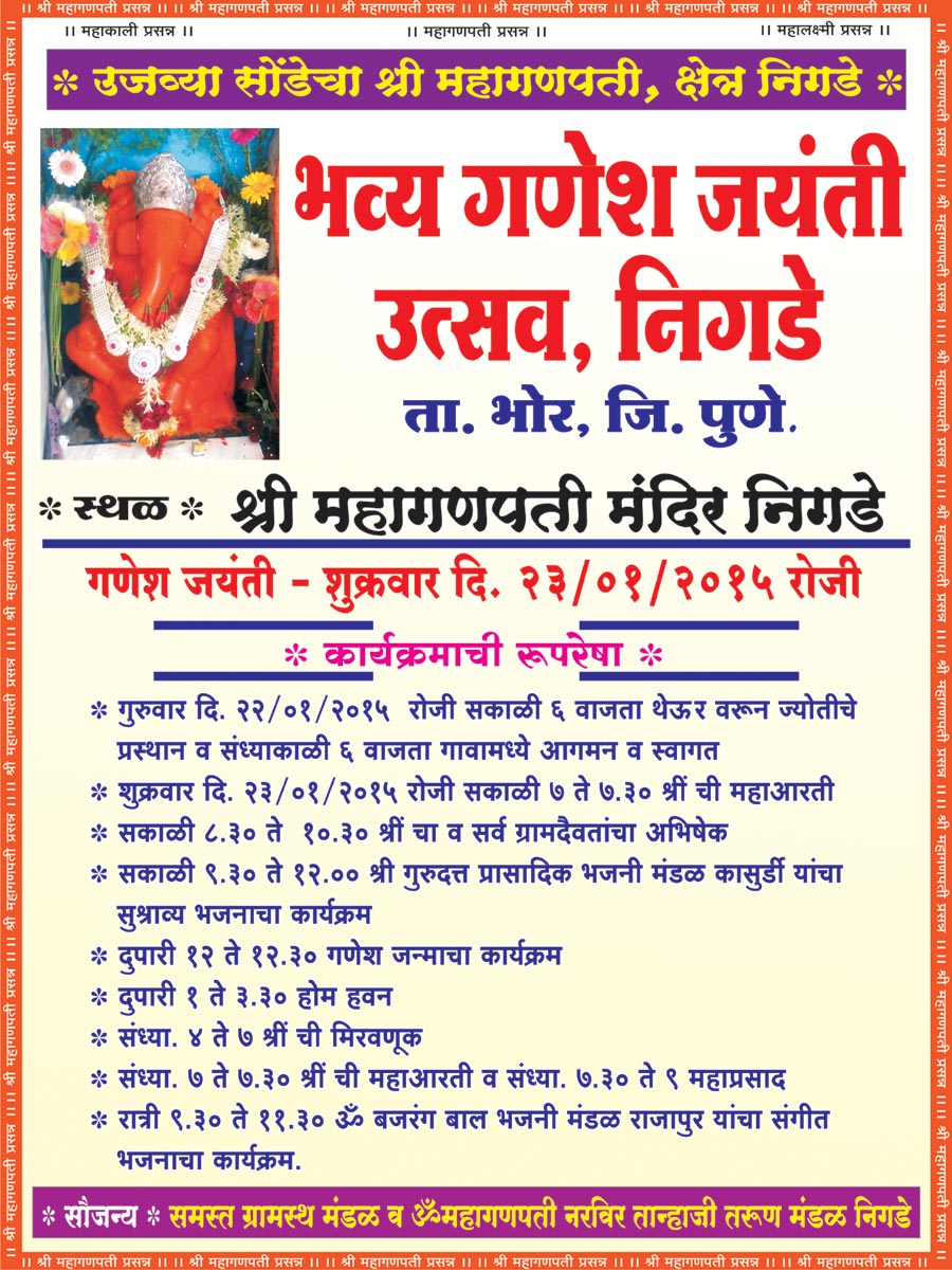 या संकेतस्थळावर श्री महागणपती , क्षेत्र निगडे सर्वव्यापी माहिती उपलब्ध करून देण्याचा प्रयत्न आम्ही करणार आहे. तसेच या संकेतस्थळाच्या माध्यमातून नागरिकांच्या तसेच तरुणांच्या प्रतिक्रिया व सूचना आमच्या पर्यंत पोहोचविण्यासाठी व्हावा, असा आमचा मानस आहे .